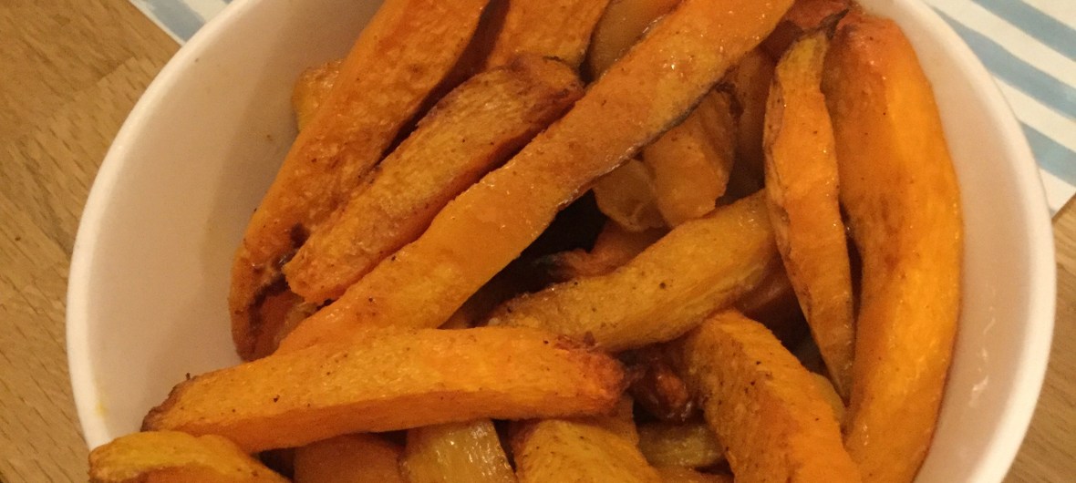 Astuce: Faites chauffer votre four 5min avant d’avoir fini de préparer, en pensant à sortir la plaque pour la manipuler plus facilement au moment d’y répartir les frites 😉